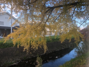(高田川沿いにある銀杏。枝垂れて美しい)