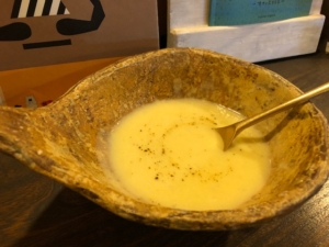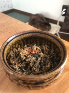 (出汁を取った後の昆布の佃煮。ゴマと鷹の爪が薬味)
